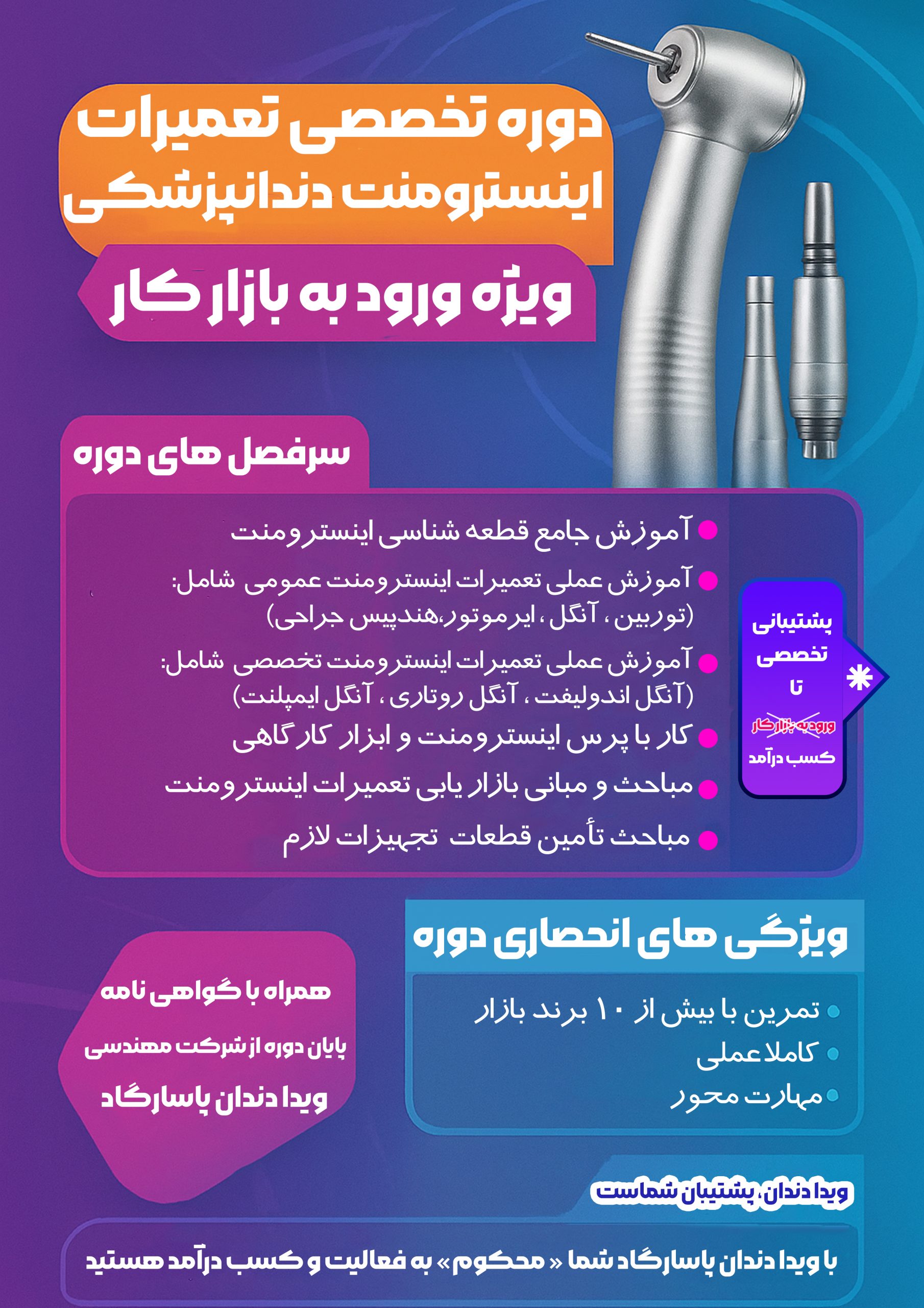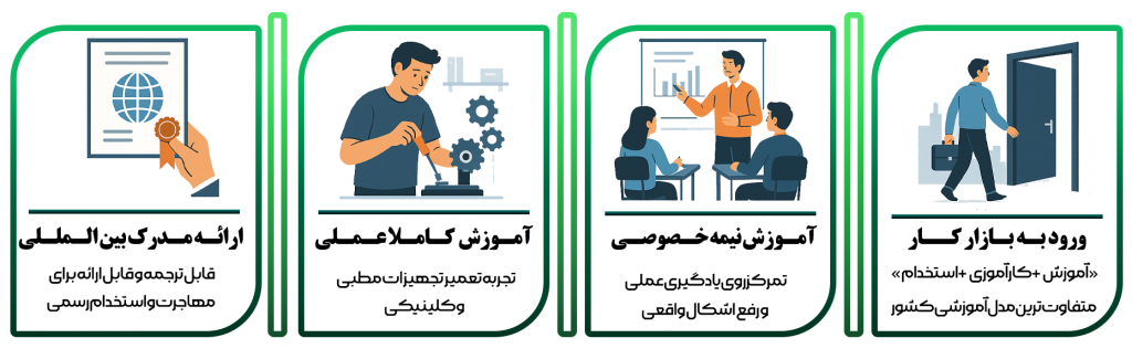 آموزشگاه تخصصی ویــدا دنــــدان پـــاســارگــاد با هدف تربیت تکنسینهای کاربلد و آماده ورود فوری به بازار کار در حوزه مهندسی تجهیزات دندانپزشکی فعالیت میکند. ما دورهای برگزار نمیکنیم که فقط چند جلسه تـئــوری بــاشد و آخــرش یــک مــدرک بیاثر تحویل بدهیم؛ تمامی دورهها کاملاً عملی پروژه محور و در محیط واقعی تعمیرات برگزار میشوند، درست در کنار تکنسینهای فعال شرکت که هر روز دهها دستگاه واقعی را تعمیر میکنند. در دپارتمان تخصصی تــعـــمــیـــرات تـــجـــهــیزات دنـــدانــــپـــــزشــــکـی، دورههایی مانند: **) تعمیرات کامل یونیت دندانپزشکی ، **) تعمیر و نگهداری اتوکلاوهای کلاس B ، **) تعمیر توربین، آنگل، هندپیس جراحی و موتور ایمپلنت برگزار میشود؛ تمام این حوزهها بازار کار بسیار قوی دارند و تکنسینهای متخصص در سراسر کشور به شدت کم هستند.مزیت رقابتی اصلی ویــدا دنــدان ایـن است که آموزشها در دل شــرکـــت خـــدمــــات پــ از فروش و تعمیرات واقعی انجام میشود؛ نه در کــلاس معـمـولی و با دستگاههای خرابشده ی آزمایشی. کارآموز از روز اول دستگاه واقعی باز میکند، عیبیابی میکند و با چالشهای واقعی روبهرو میشود. پس از اتمام دوره، کـارآمـوزان وارد مرحله کارآموزی عملی، انجام پروژه واقعی و امکان همـکاری یـــا استخدام در شبکه سراسری خدمات و فروش شرکت میشوند. به همین دلیل، خروجی ما تکنسین آماده کار است، نه دانشجوی تماشاگر.کلیه دورهها به صورت نیمهخصوصی و با ظرفیت محدود برگزار میشوند تا آموزش دقیق و اختصاصی باشد. کــارآمـــوزان از مشاورههای تخصصی بـرای ورود به بازار کار، راهاندازی کسبوکار، قیمتگذاری خدمات، تهیه ابزار و حتی جذب مشتری بهرهمند میشوند.در پایان دوره، گواهینامـه بینالمللی سـازمـان فنیوحرفهای اعطا میشود که امکان دریافت مجوز رسمی و فعالیت قانونی را فراهم میکند.اگر تصمیم دارید آیندهتان را بسازید و وارد یــکــی از پــرسودترین و کــمرقیبترین بازارهای تخصصی کشور شوید، ویدا دندان پاسارگاد بهترین نقطه شروع است.